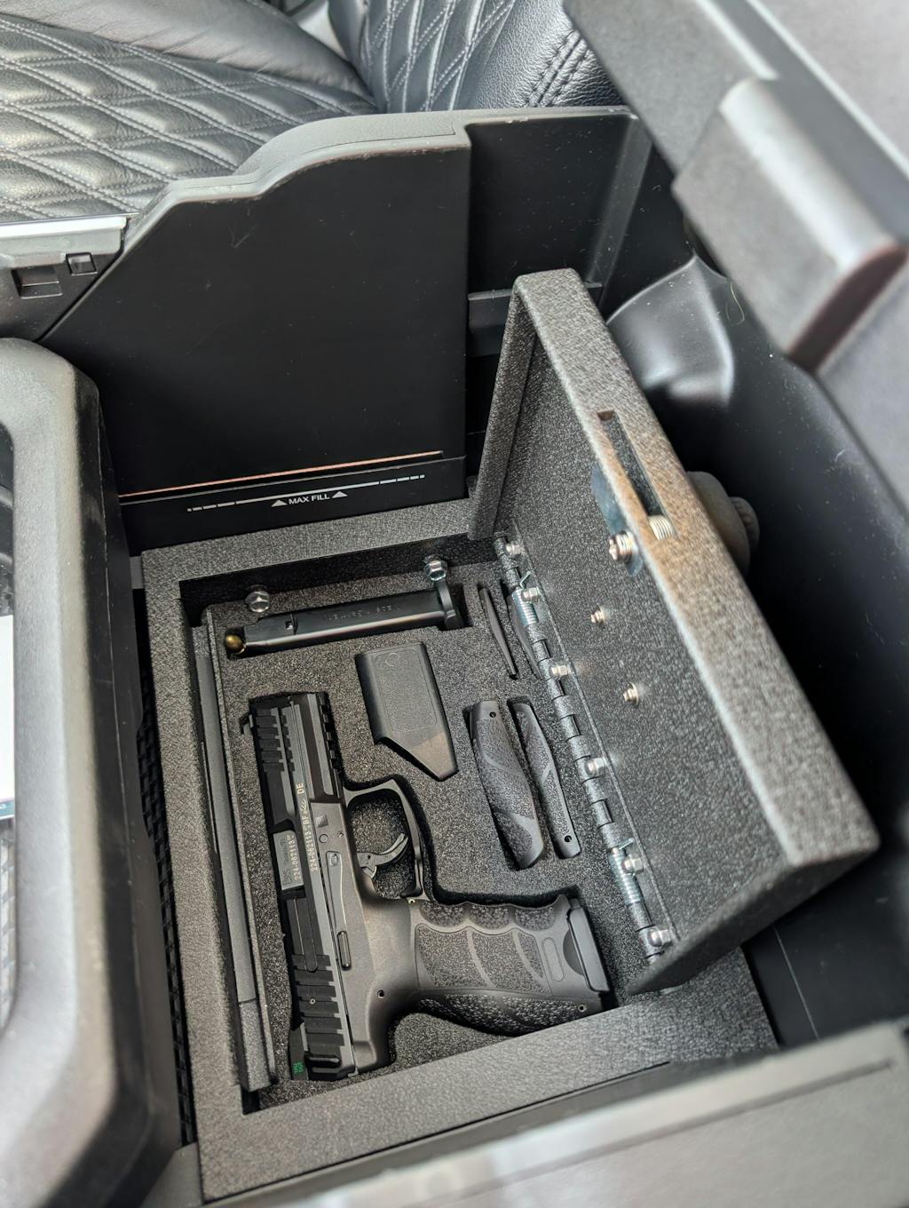 Our RAM 1500 console safe, also suitable for Ram 2500 and 3500, is compatible with RAM model years 2019-2024 where the console max fill lines measures 3.89" from bottom of console to bottom of fill line marker. This safe is available with your choice of key lock, 3-digit lock, 4-digit lock, Elite 4-digit lock, Elite™ Electronic Lock options.